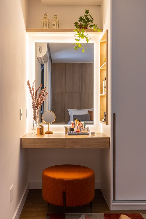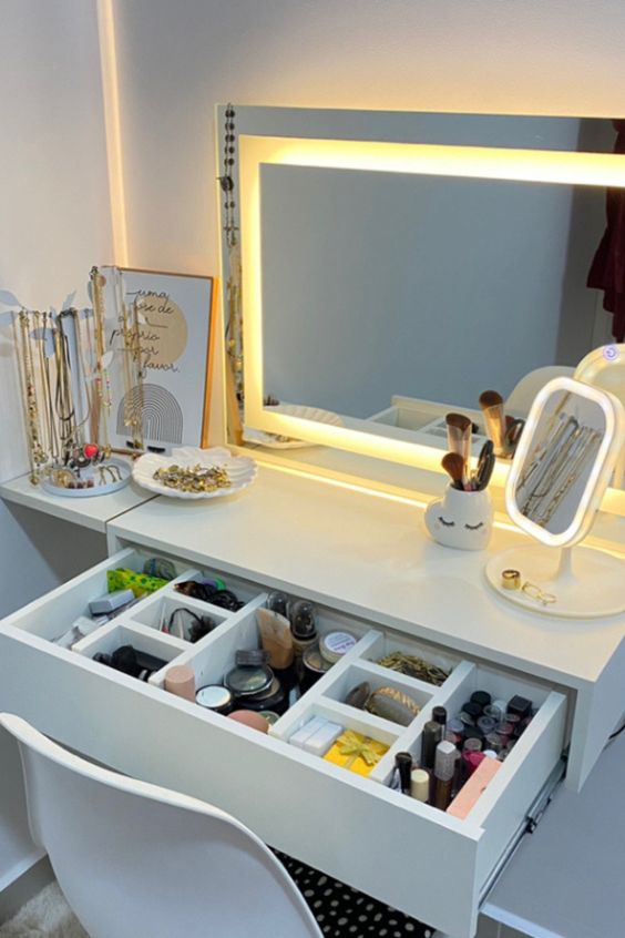 Uma boa iluminação também ajuda a destacar a organização da penteadeira, tornando o espaço mais atraente e prático.